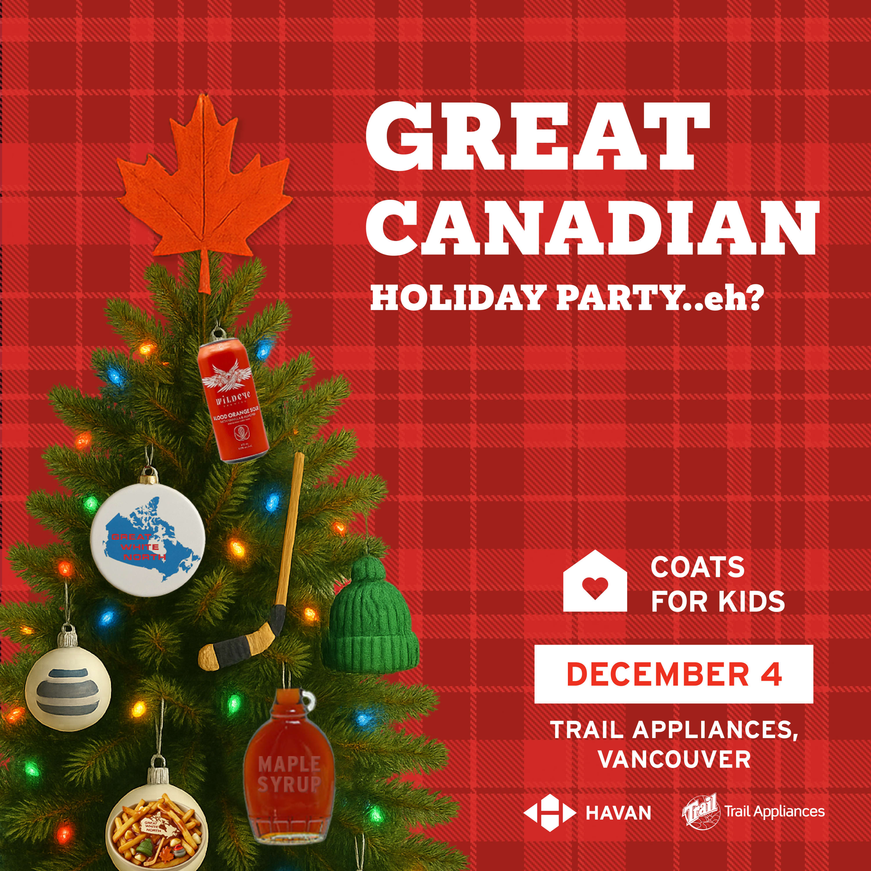 Join HAVAN on Thursday, December 4, from 6:00–8:30 p.m. at Trail Appliances, Vancouver for the Great Canadian Holiday Party…eh? — our festive wrap-up to our Coats for Kids Campaign.