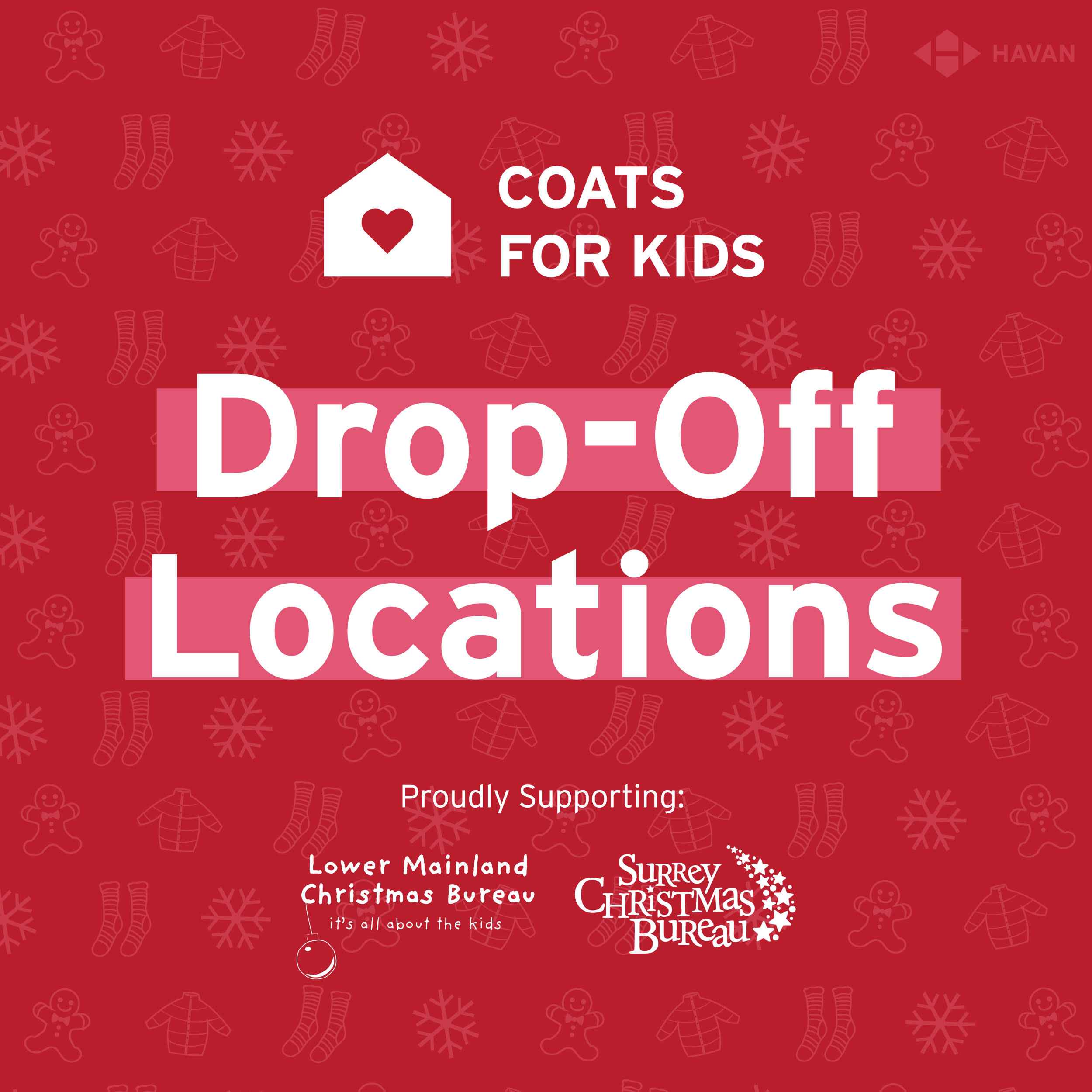 This year marks HAVAN’s 31st anniversary of the Coats for Kids Campaign, and we’re aiming to make it our biggest yet! Become a drop-off location and help us collect gently used coats, outerwear, and new toys to support the Lower Mainland and Surrey Christmas Bureaus, bringing warmth and joy to families in need.